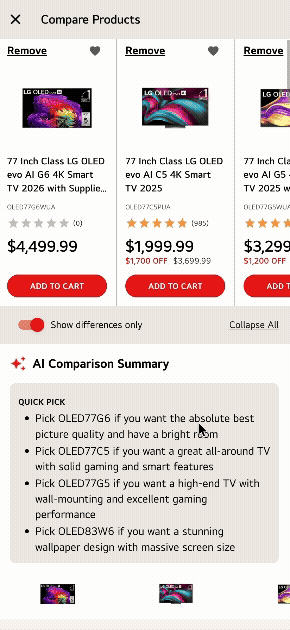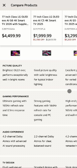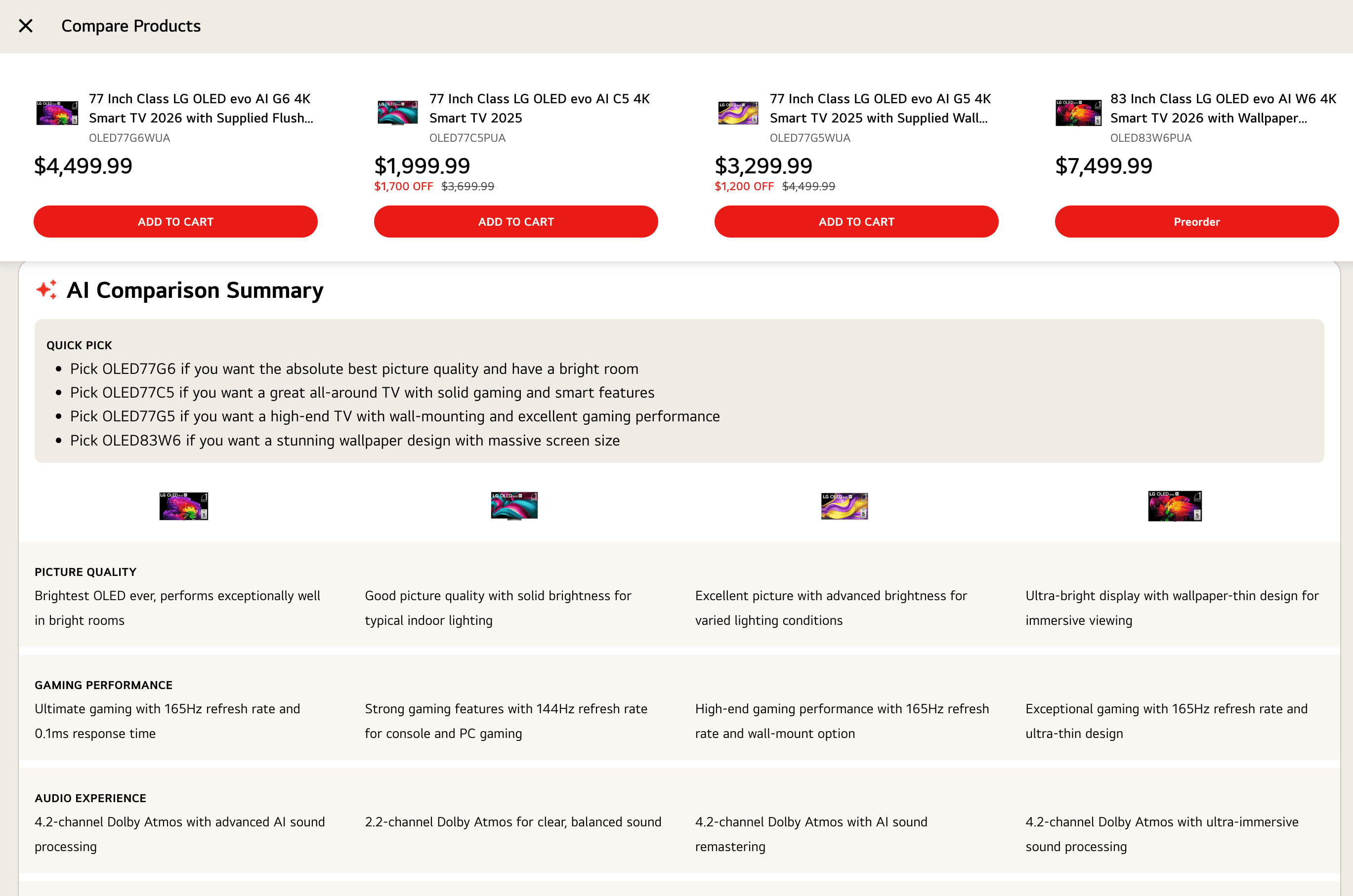 We included a "Quick Pick" to help shoppers identify which TV matched their watching style, whether that was gaming, cinematic, or high-end design. This was followed by the four most sought after categories for TVs: picture quality, gaming performance, audio experience, and design. Each category broke down how the compared TVs stacked up within those areas. We rounded it out with a shared features section highlighting what was available across all compared products.